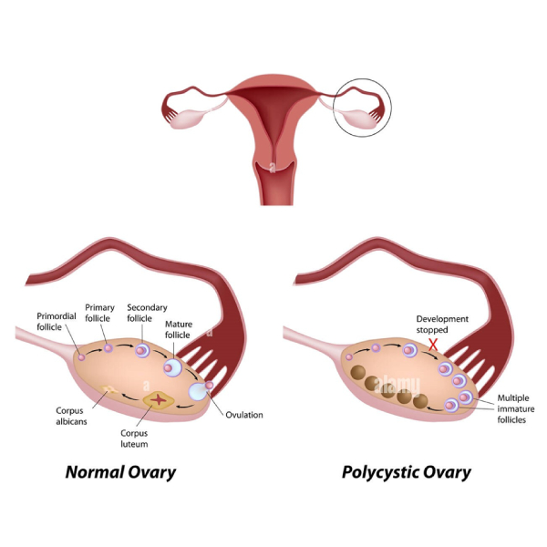 PCOS stands for Polycystic Ovary Syndrome. It occurs when the ovaries overproduce androgen hormones, often referred to as 'male hormones'. This hormonal imbalance can affect your menstrual cycle, ovulation, and even cause physical changes like excess hair growth or acne.